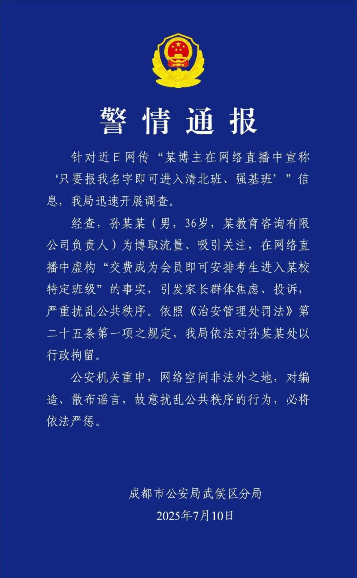 针对近日网传“某博主在网络直播中宣称‘只要报我名字即可进入清北班、强基班’”信息,我局迅速开展调查。